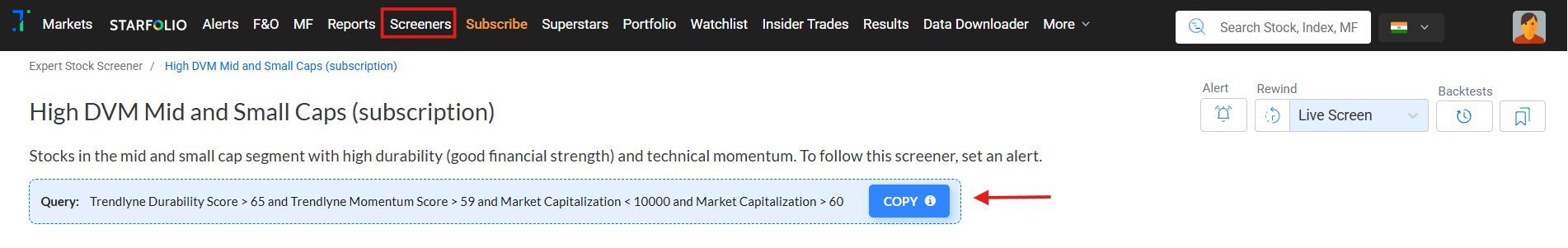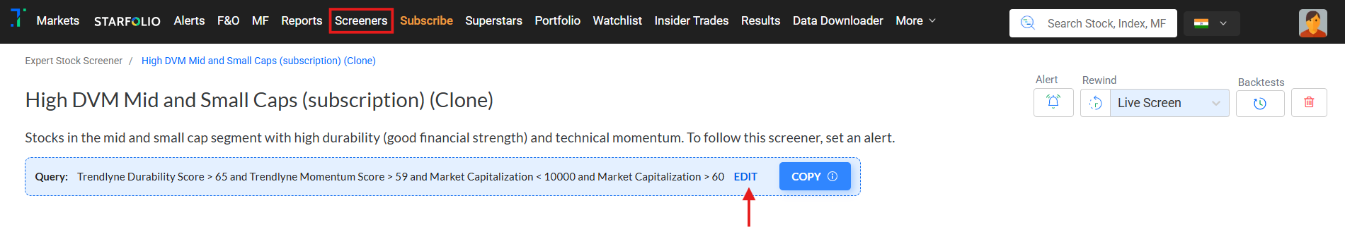Begin by creating a copy of the screener you want to modify. Click on ‘COPY’ as shown in the image below.