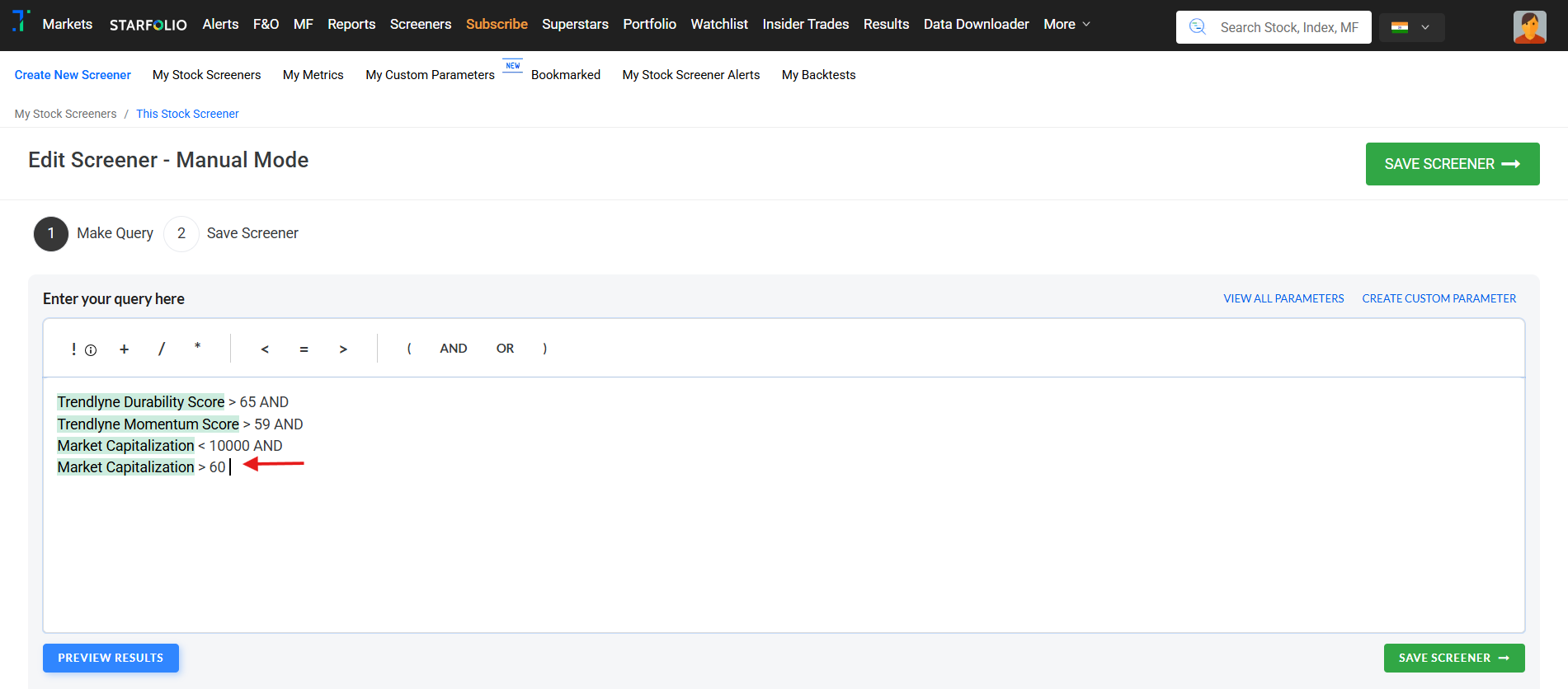 You can modify the screener query, including those for prebuilt screeners, by following these steps: