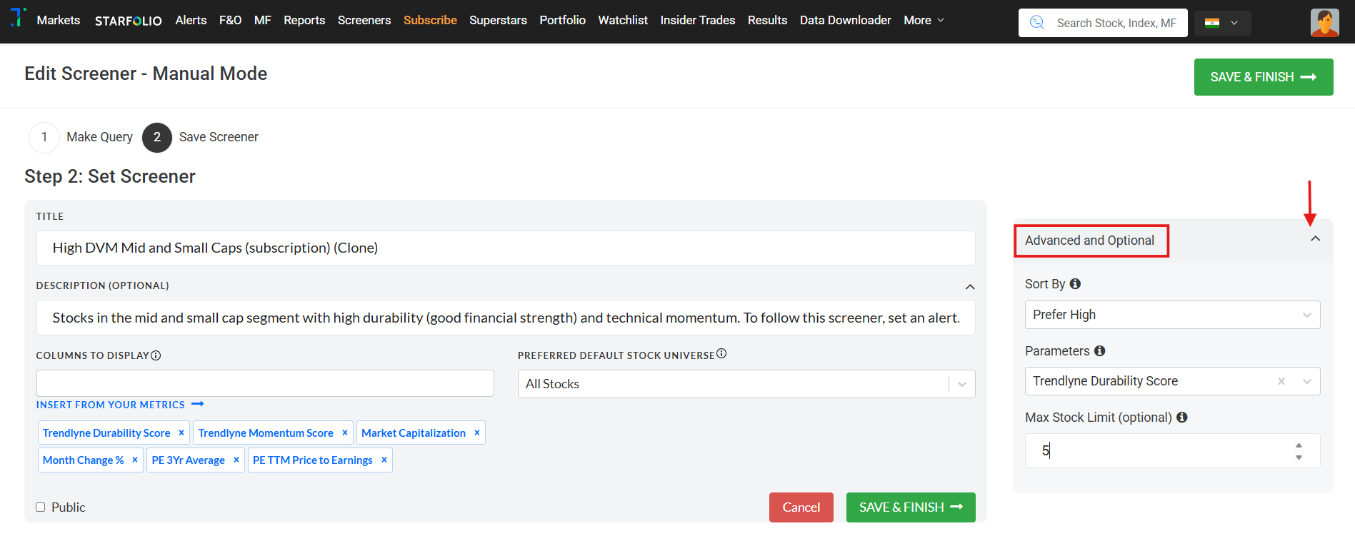 Use the customization options in the ‘Advanced and Optional’ section to enhance your screener.