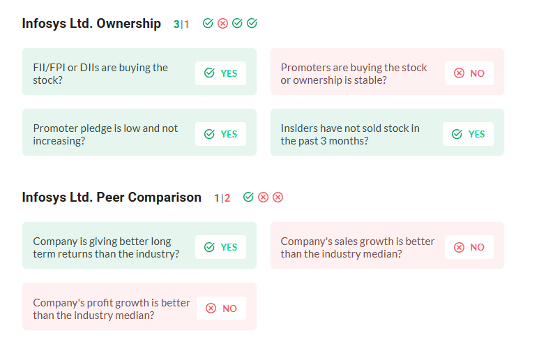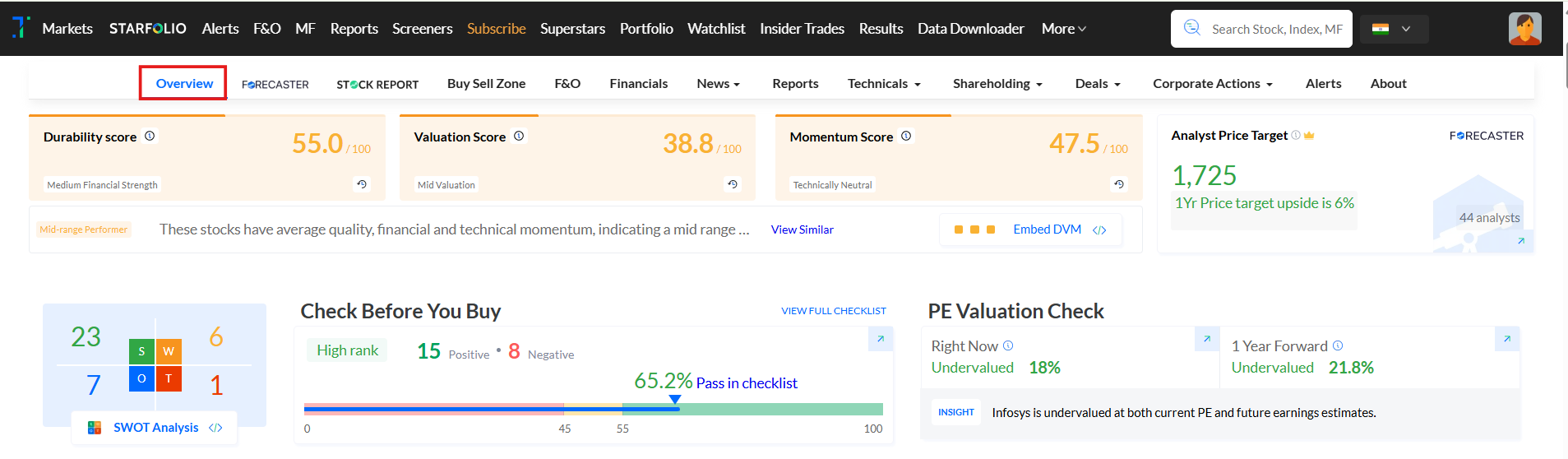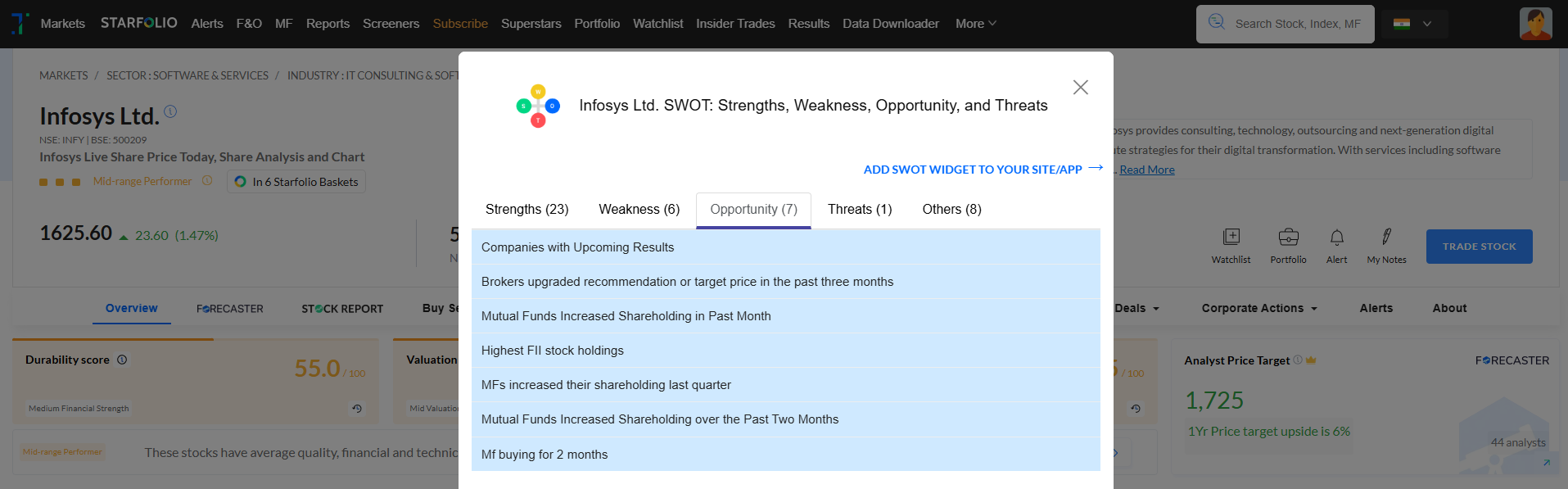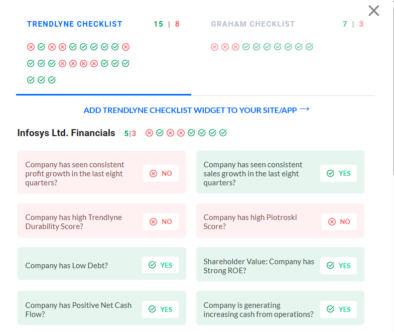 Some other features that are available on Trendlyne are SWOT analysis and checklists for stocks. These are available on the stock overview page. Here is an example for Infosys.