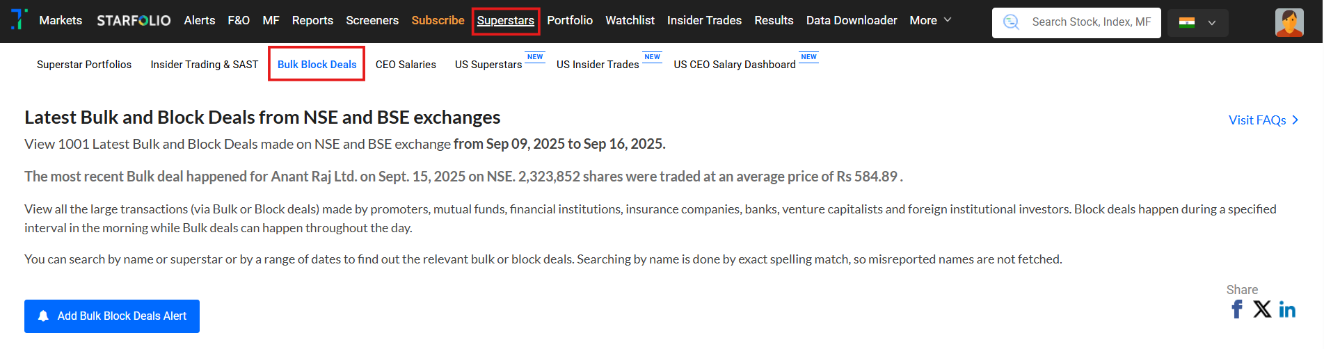 ‘Bulk Block Deals’ show large trades carried out by promoters, banks, financial institutions, foreign institutional investors, and others. Block deals take place during morning hours while Bulk deals can take place at any time during the day.