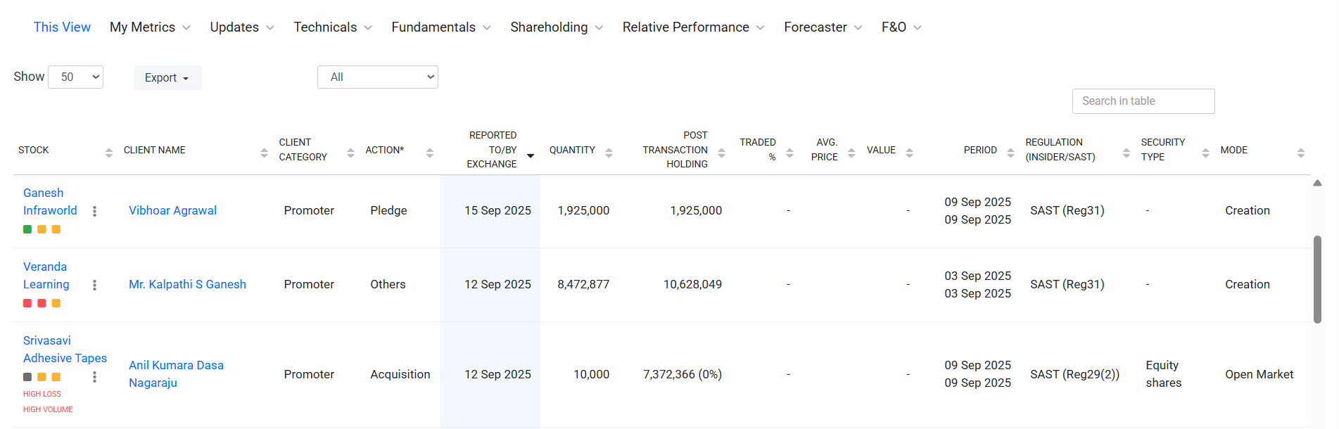 Insider Trading involves company insiders, such as key employees, promoters, or directors, buying or selling the company’s stocks or securities and reporting these transactions to the exchange. This practice is legal when properly disclosed, adhering to the SEC's Prohibition of Insider Trading regulations. Trendlyne’s ‘Insider Trading & SAST’ feature tracks these disclosed transactions.