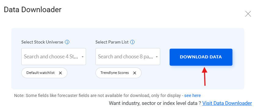 To use this feature, select your stock universe and desired parameters from the dropdown menu, as shown below. Once set, click 'Download Data' to receive your report as an Excel file.