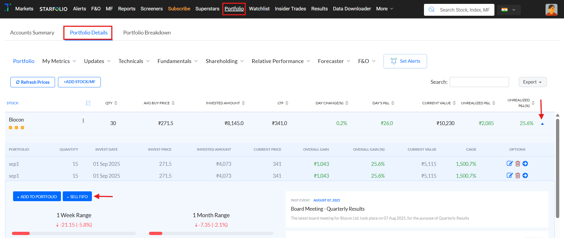 Here, you can manually add buy and sell transactions using the 'Add Holding' and 'Sell FIFO' buttons.