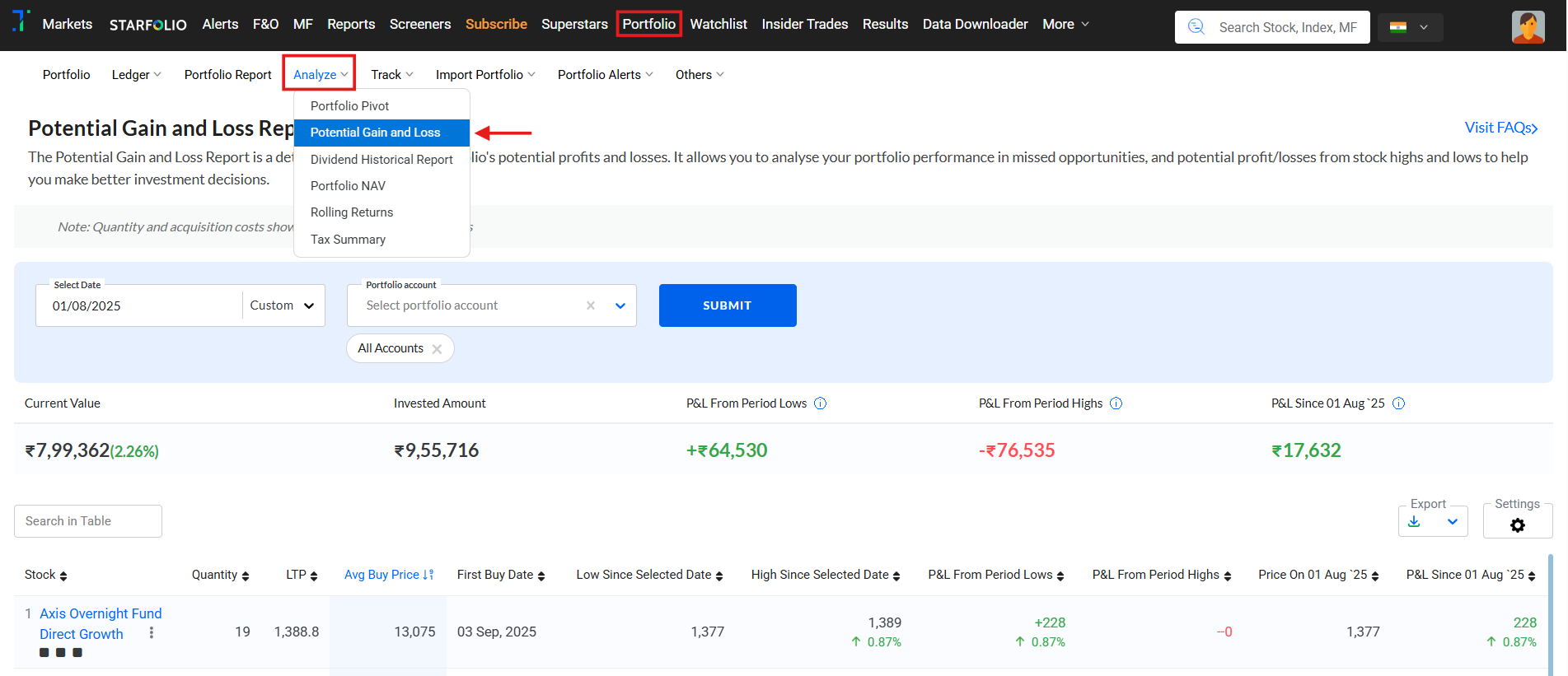The Potential Gain and Loss Report analyzes your portfolio’s performance, highlighting potential profits and losses. It helps you assess missed profit opportunities by comparing stock highs and tracks gains from stock lows.