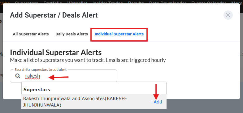 b) Use the search bar to find superstars and click +Add to include them in your alerts list.