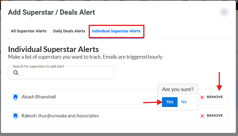 c) To remove a superstar, click the “X Remove” option next to their name and confirm by clicking on Yes.