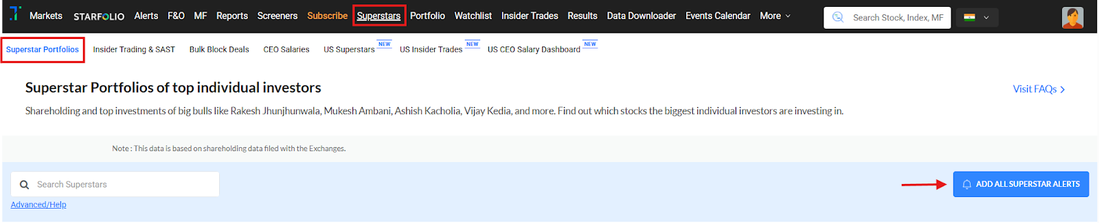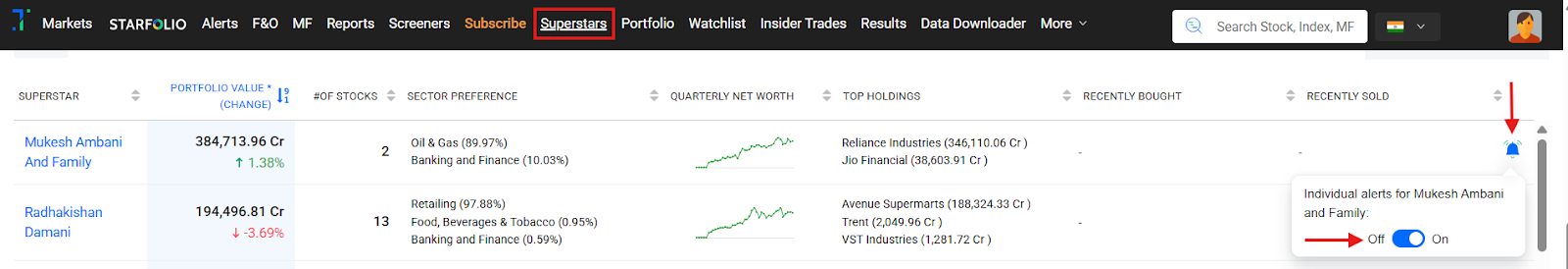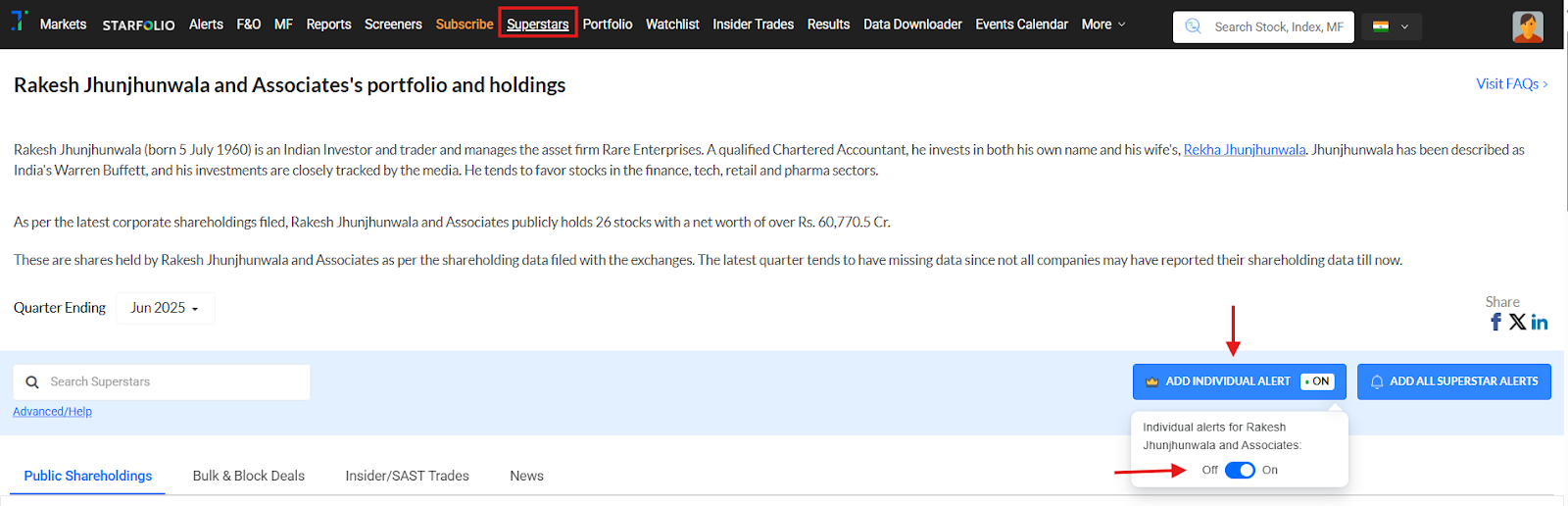 b) Use the toggle to enable or disable alerts for that superstar (e.g., Rakesh Jhunjhunwala and Associates’ portfolio as shown in the image below).