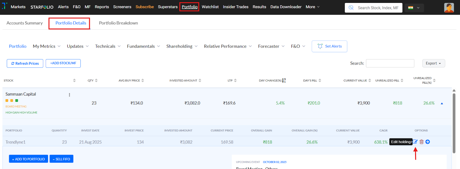 1. Click on the stock’s ‘^’ dropdown in your Portfolio.